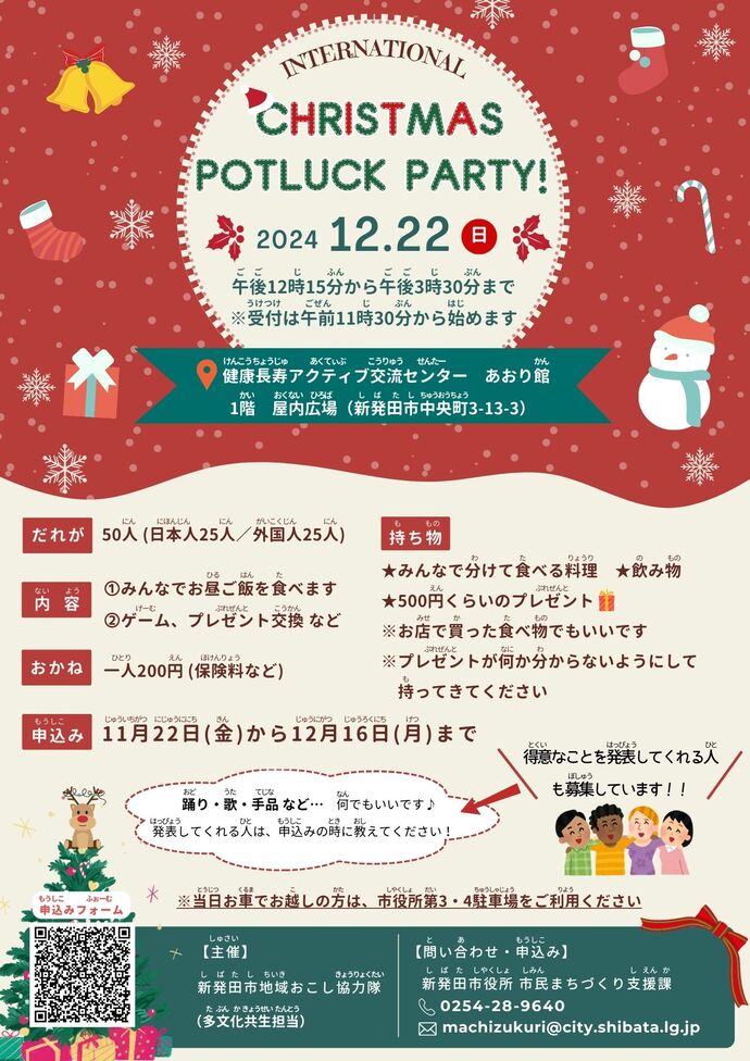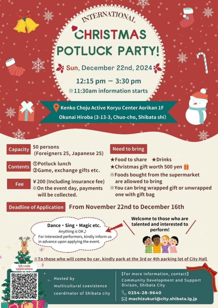 新発田市で「CHRISTMAS POTLUCK PARTY!」が開催されます。各国の食文化を通してその国を身近に感じ、気軽に楽しく交流しませんか?