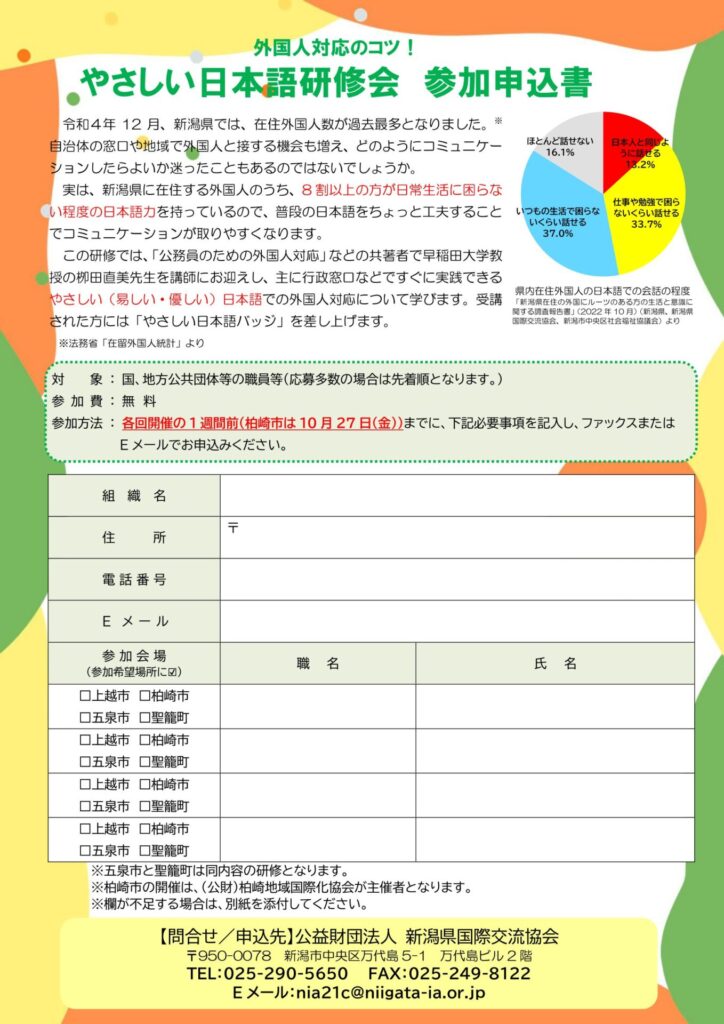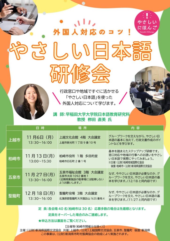 そのため、新潟県国際交流協会では、昨年度に引き続き、外国人をはじめ誰にとっても伝わりやすい「やさしい日本語」による行政窓口等でのコミュニケーションに関する基礎研修会を下記のとおり開催することといたしました。