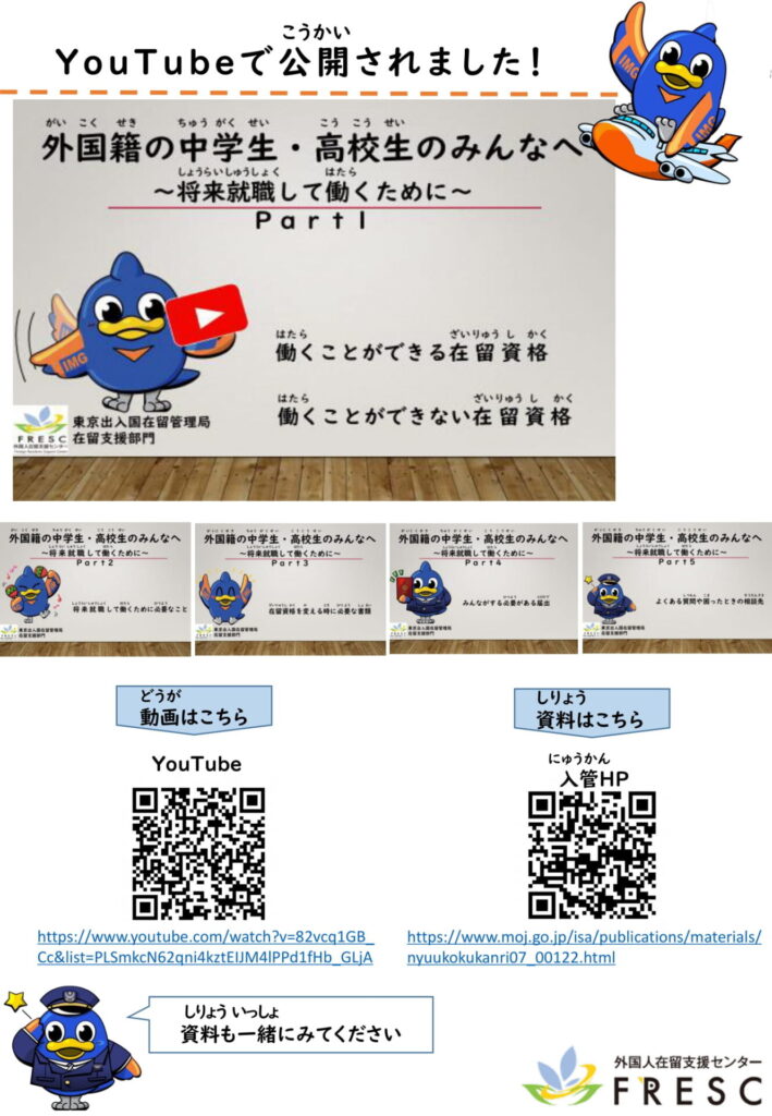 そんな外国籍の中学生・高校生に向けて、東京出入国在留管理局が在留資格についてのYouTube動画を公開しています。東京入管のマスコットキャラクター「とりぶ」がわかりやすく説明してくれているので、ぜひ見てみてください。