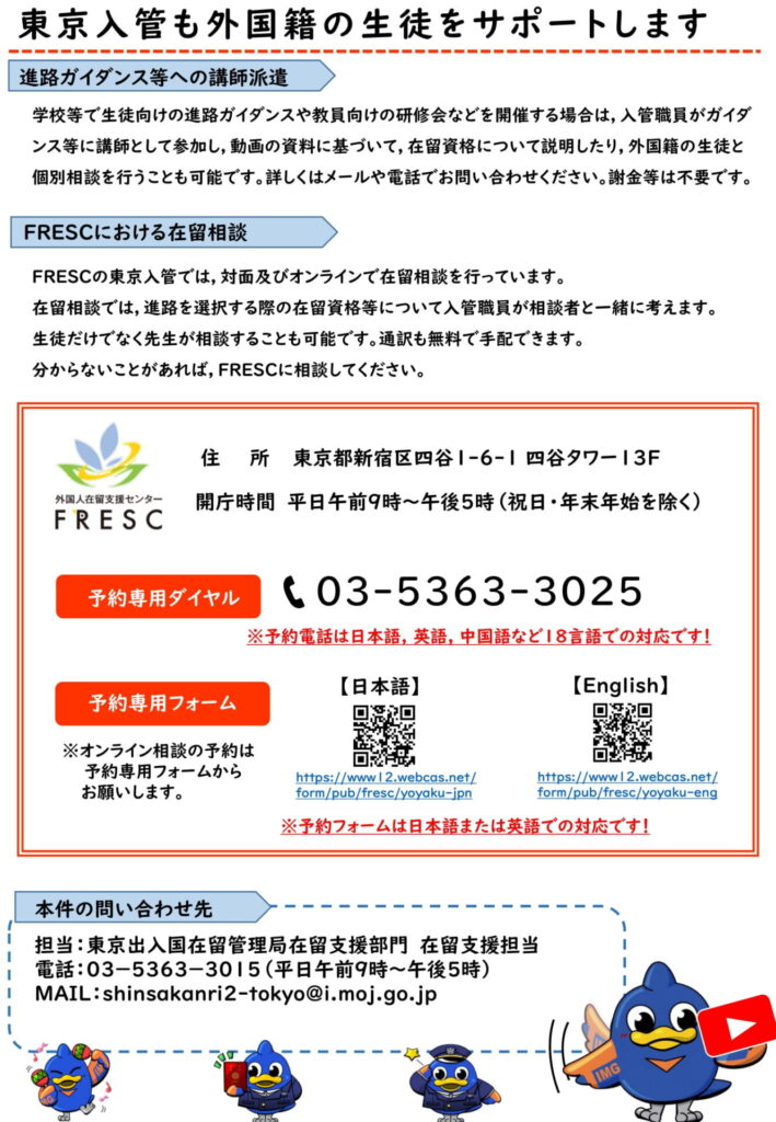FRESC(外国人在留支援センター) TEL:03-5363-3025(要予約)