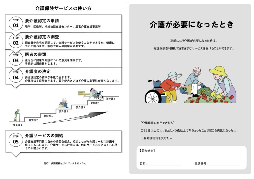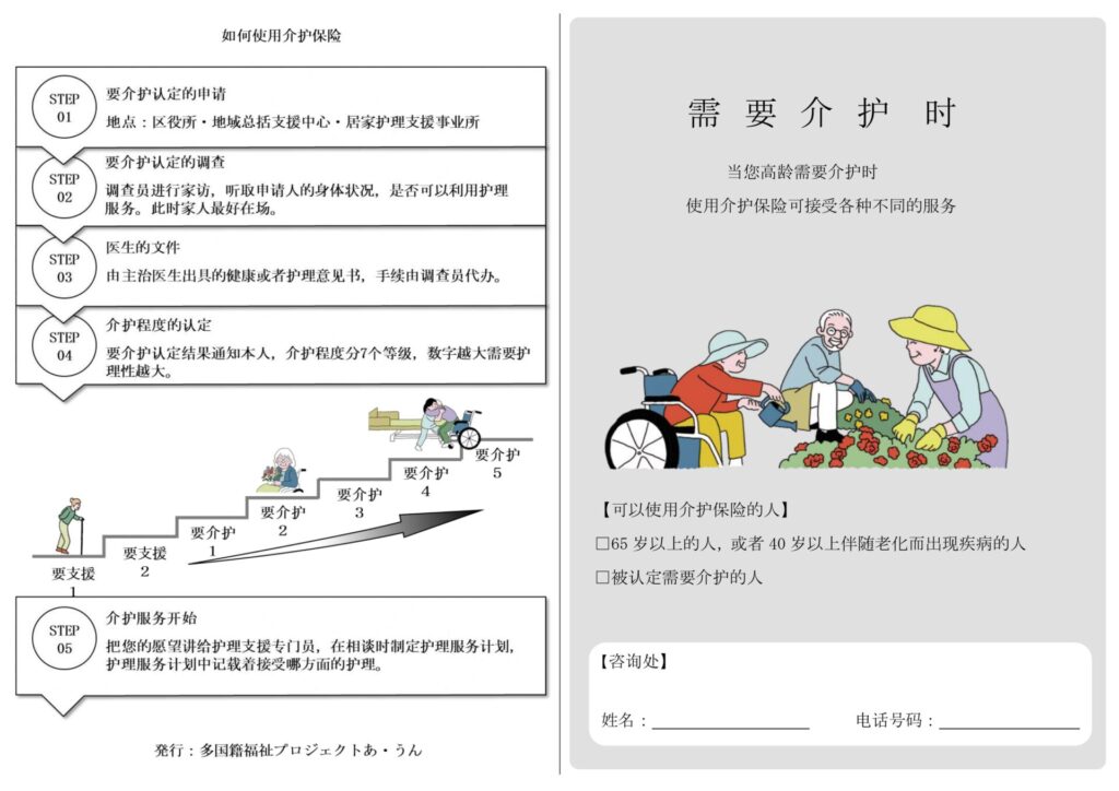 新潟市東区社会福祉協議会やあかりケアプランセンターなどによる「多国籍福祉プロジェクトあ・うん」では、外国人高齢者が安心して老後生活を送ることができるよう、介護保険制度の基礎知識や介護保険サービスを利用する方法等についてわかりやすく説明した「外国人向けの介護保険制度説明リーフレット」(日本語版・中国語版)を作成しました。医療・介護・福祉サービスに携わる方に資料提供していますので、詳細は下記問合せ先までお問い合わせください。