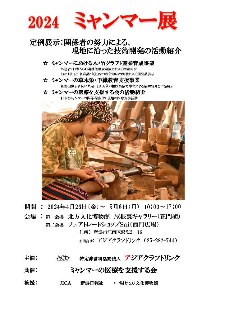 特定非営利法人アジアクラフトリンク主催「2024ミャンマー展」開催のお知らせ